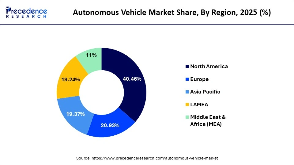 North America dominated the market with a 40.46% share in 2025. The well-developed technological startups and growing development of smart city projects increase the production of AV. The increasing consumer awareness about safety and the development of advanced safety features increase demand for AV. The ideal testing environments and the presence of extensive real-world testing increase the adoption of AV. The presence of major players like Cruise, Waymo, and Tesla drives the overall growth of the market.